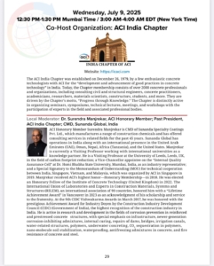 India Chapter of ACI is proud to announce that the ACI’s most prestigious “Chapter Activities Award” for the year 2025 is announced by ACI USA to our Immediate Past President, Mr. Sunny Surlaker.